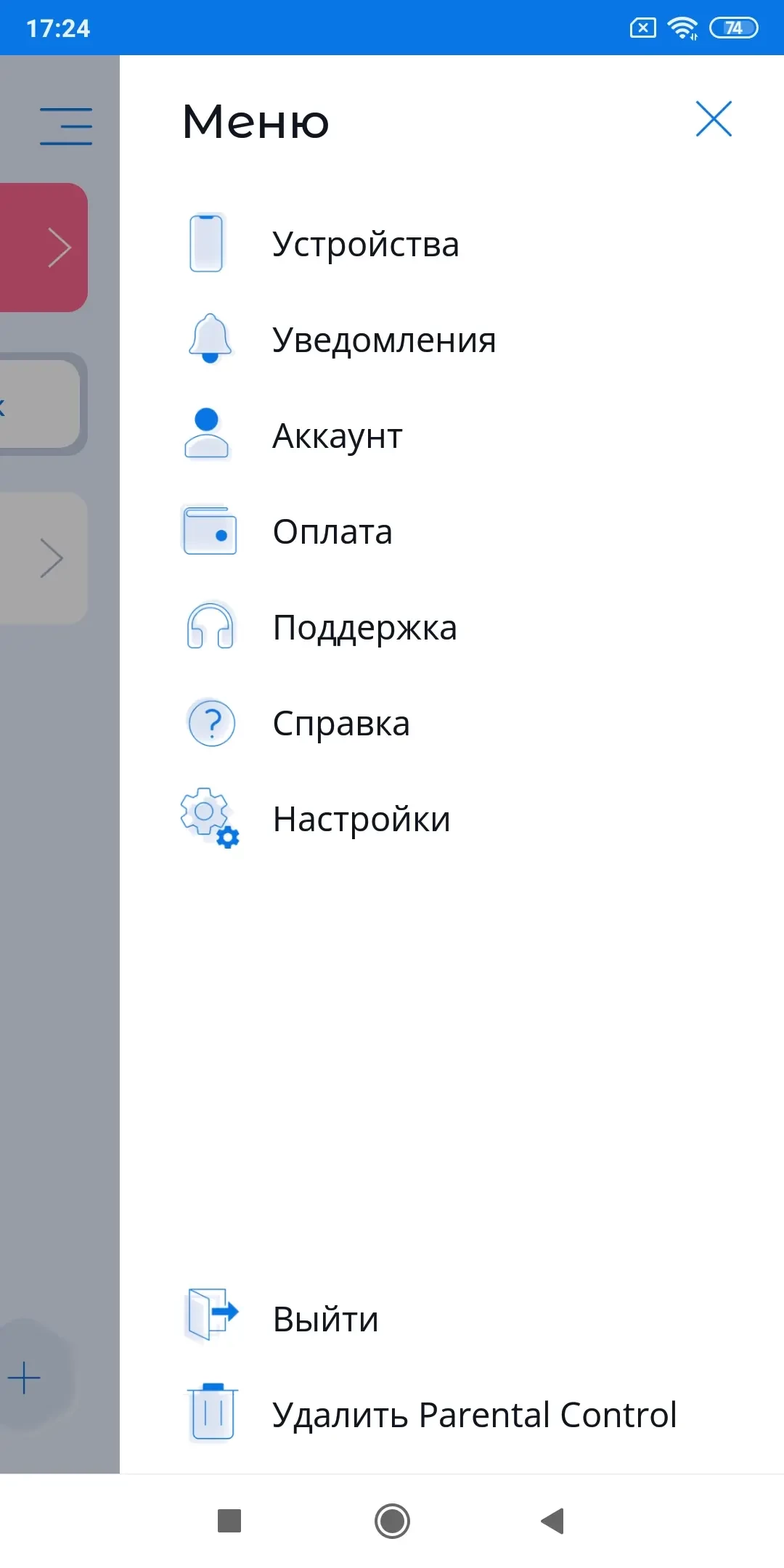 Кнопка «Настройки» в основном меню - возможность менять настройки с родительского устройства на выбранном детском устройстве.