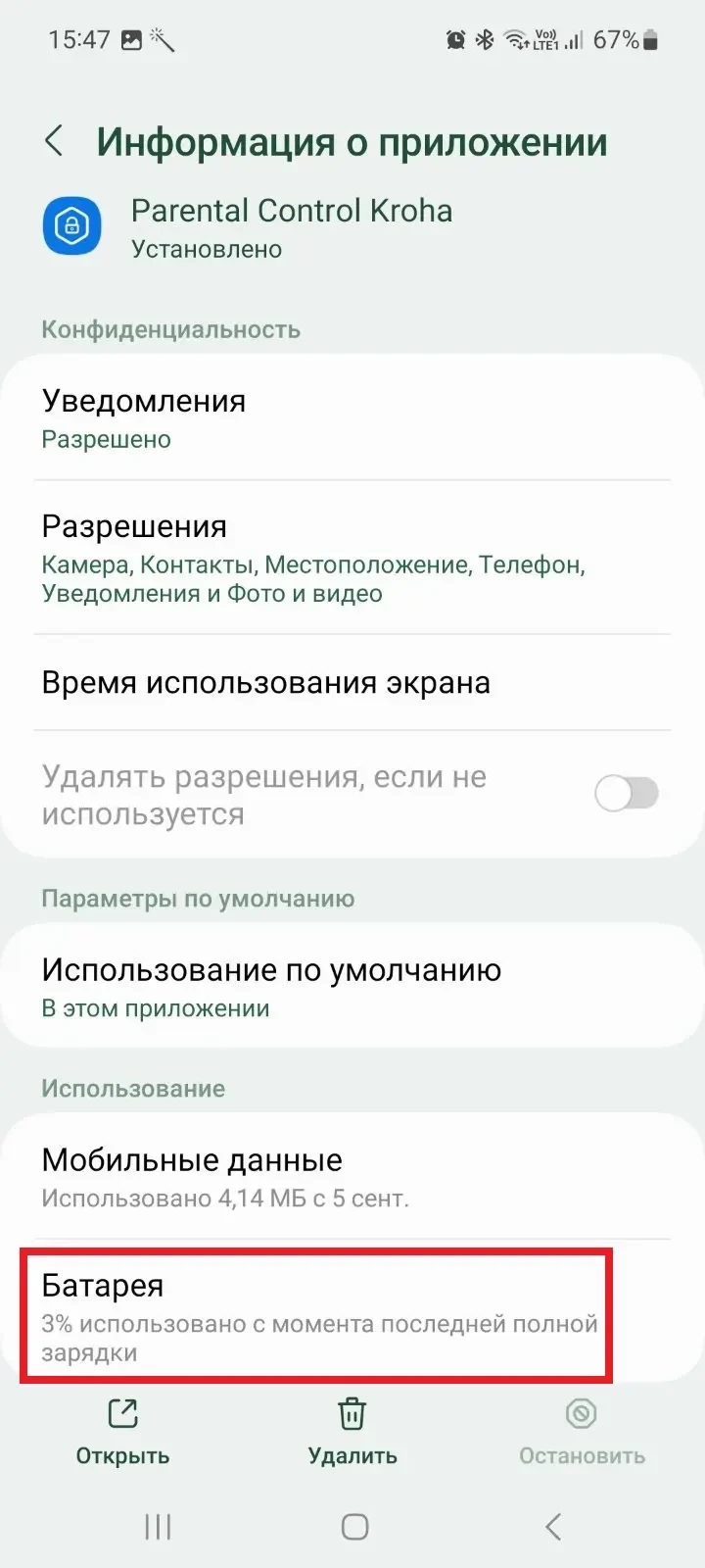 - Откройте “Настройки” на устройстве ребенка > Приложения > Parental Control Kroha > Аккумулятор (Батарея) > Не оптимизировать.