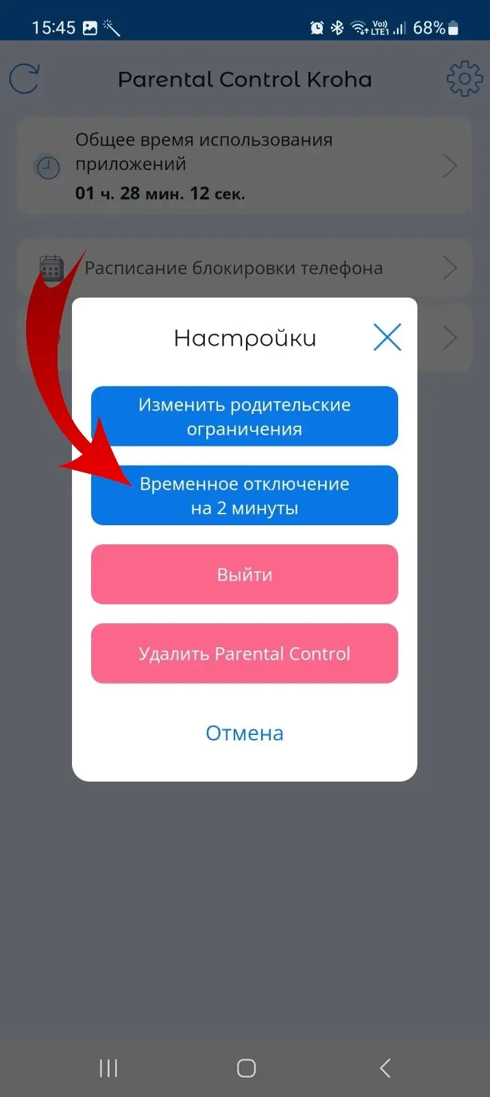 Затем откройте приложение Parental Control Kroha на устройстве ребенка > Нажмите иконку шестеренки > нажмите кнопку "Выключить на 2 минуты" > введите ПИН код. Это необходимо, чтобы настройки на устройстве ребенка не блокировались 2 минуты и вы могли проверить их.