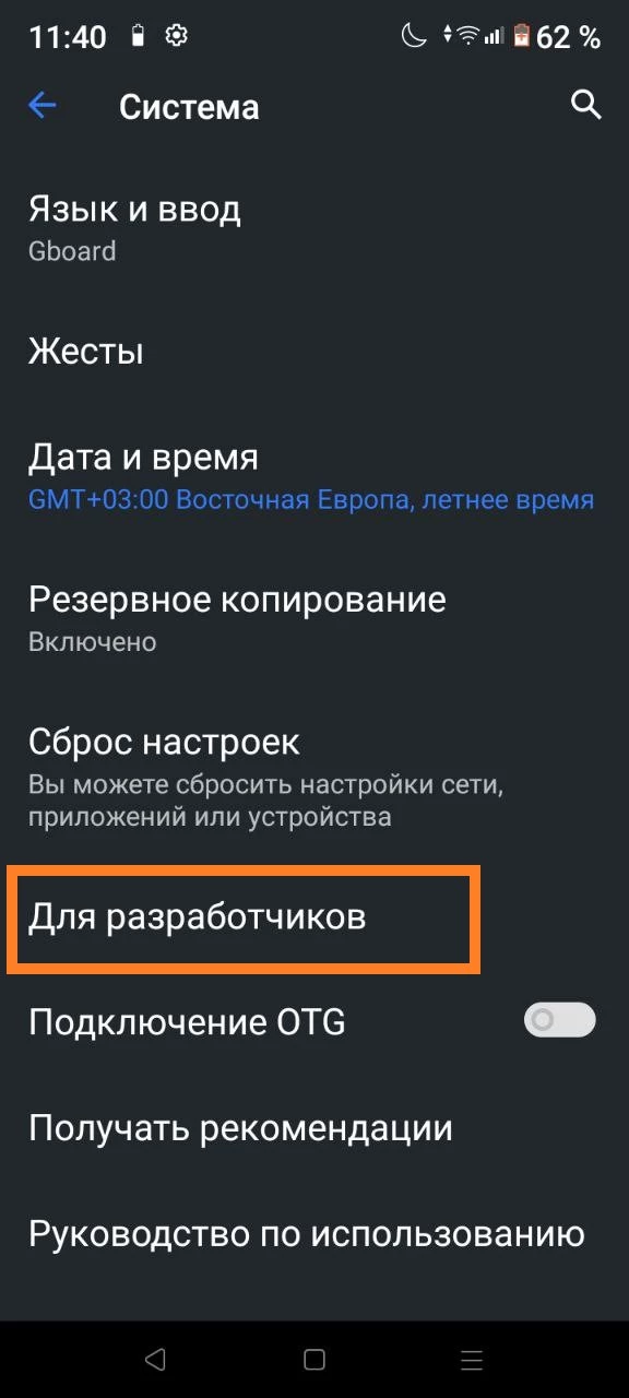 - Нажмите на "Для разработчиков".