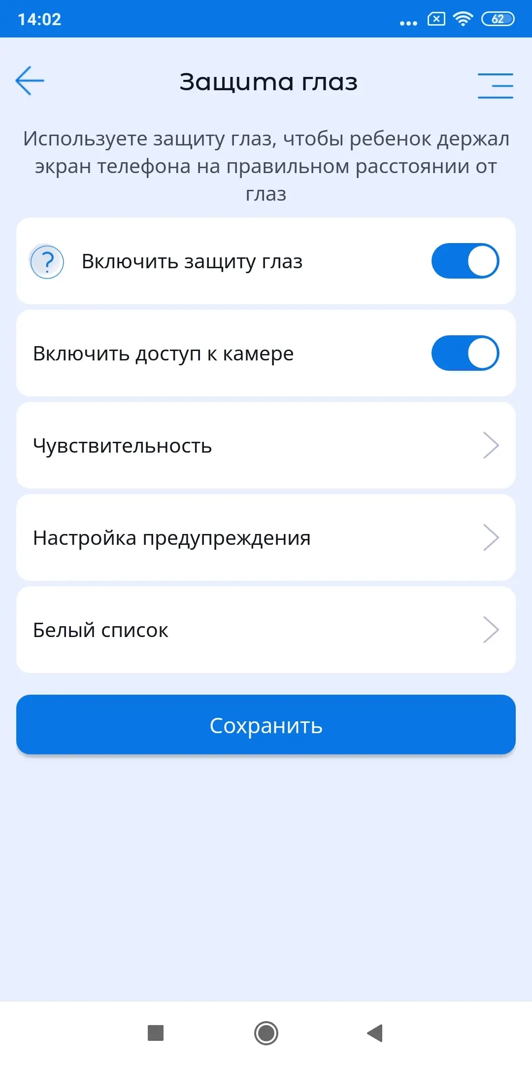 Безопасное расстояние от экрана до глаз по умолчанию устанавливается на основании рекомендаций врачей офтальмологов (30 см). Данное расстояние родители могут регулировать ползунком в нижней части экрана функции Защита глаз.
