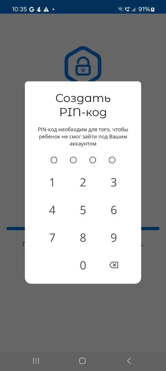 - Далее, приложение Parental Control Kroha откроется на детском смартфоне / планшете на экране для создания ПИН кода. Создайте ПИН код.