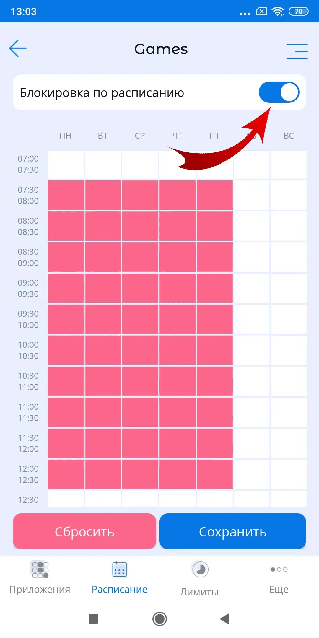 Для установки расписания в функции «Блокировка приложений», родители настраивают блокировки программ в период времени, когда ребенок не должен отвлекаться на игры, просмотр видео или общение в социальных сетях (например, в школе). Заблокируйте нужный период времени, зажав ячейку начала периода и доведя выделение ячеек до конца периода блокировки. Активируйте переключатель «Блокировка по расписанию». Время, соответствующее выделенным ячейкам будет заблокировано для приложений выбранной категории.