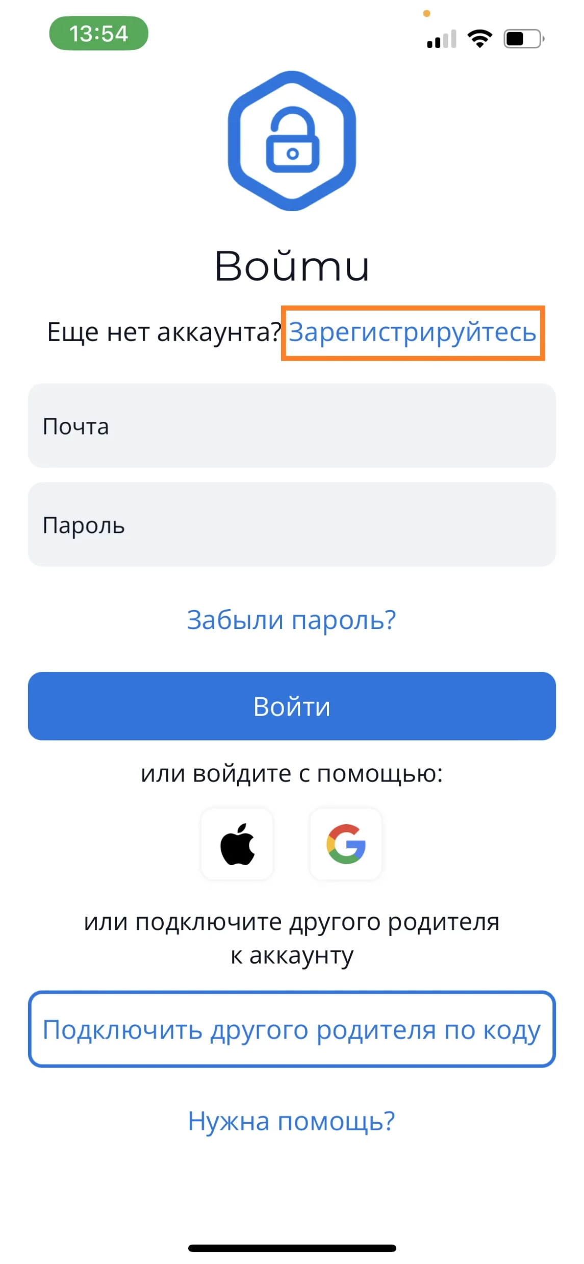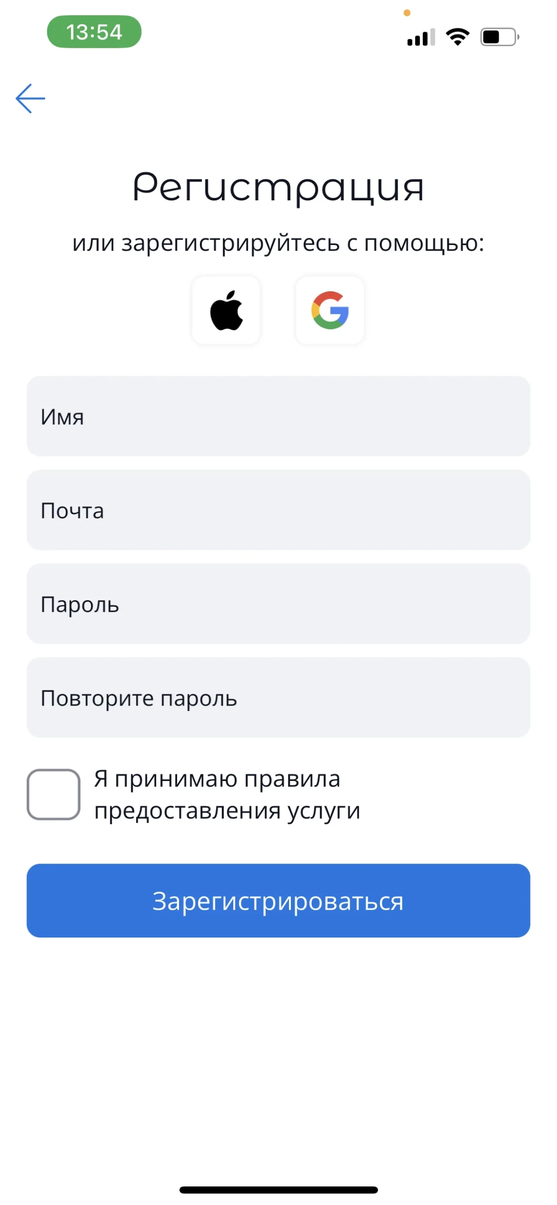 3. На экране «Регистрация» Вы можете зарегистрироваться с помощью учётной записи Apple, Google или ввести имя, адрес электронной почты и создать пароль.