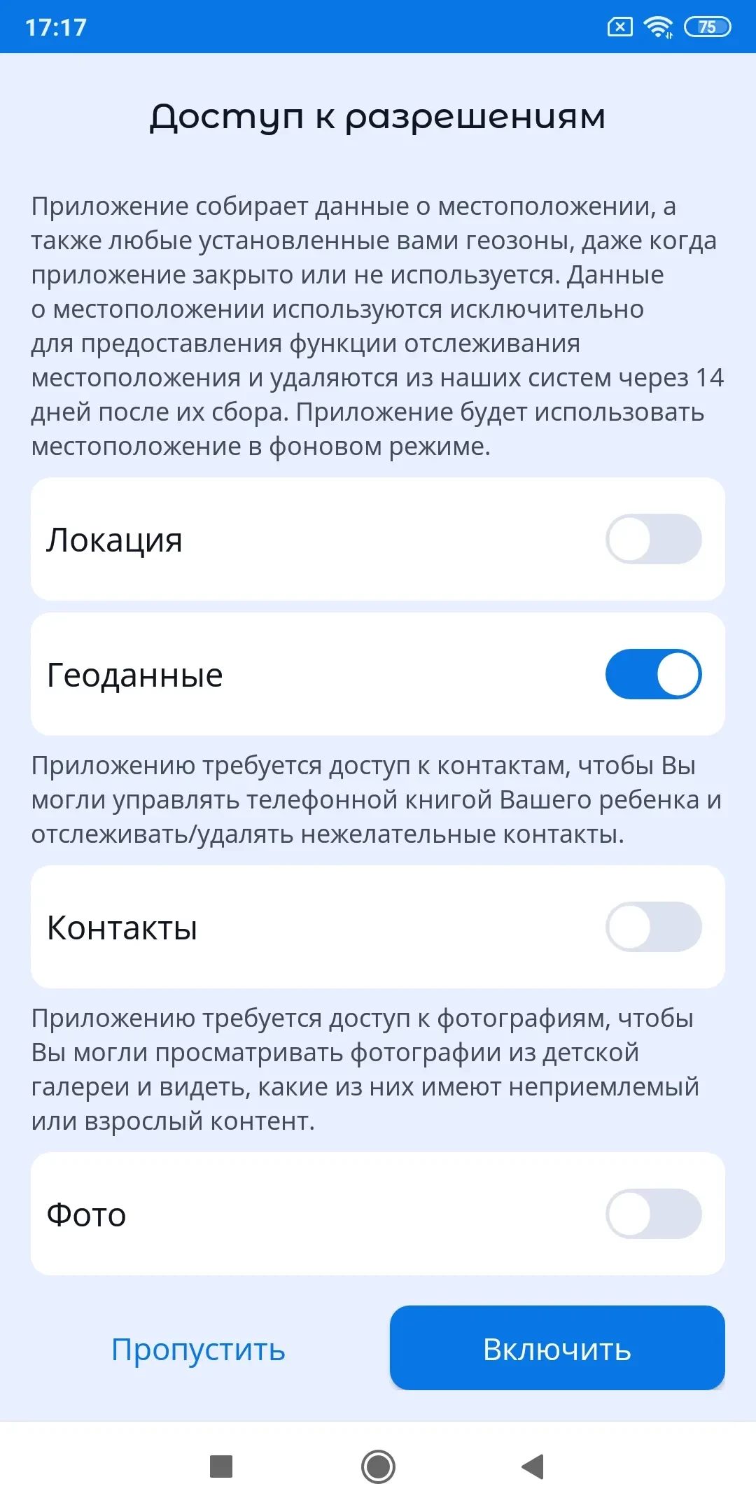 - «Локация», «Геоданные», «Данные о физической активности» - если Вы хотите отслеживать местоположение ребенка и задавать геозоны, при нарушении которых Вы получите уведомление на свой телефон;