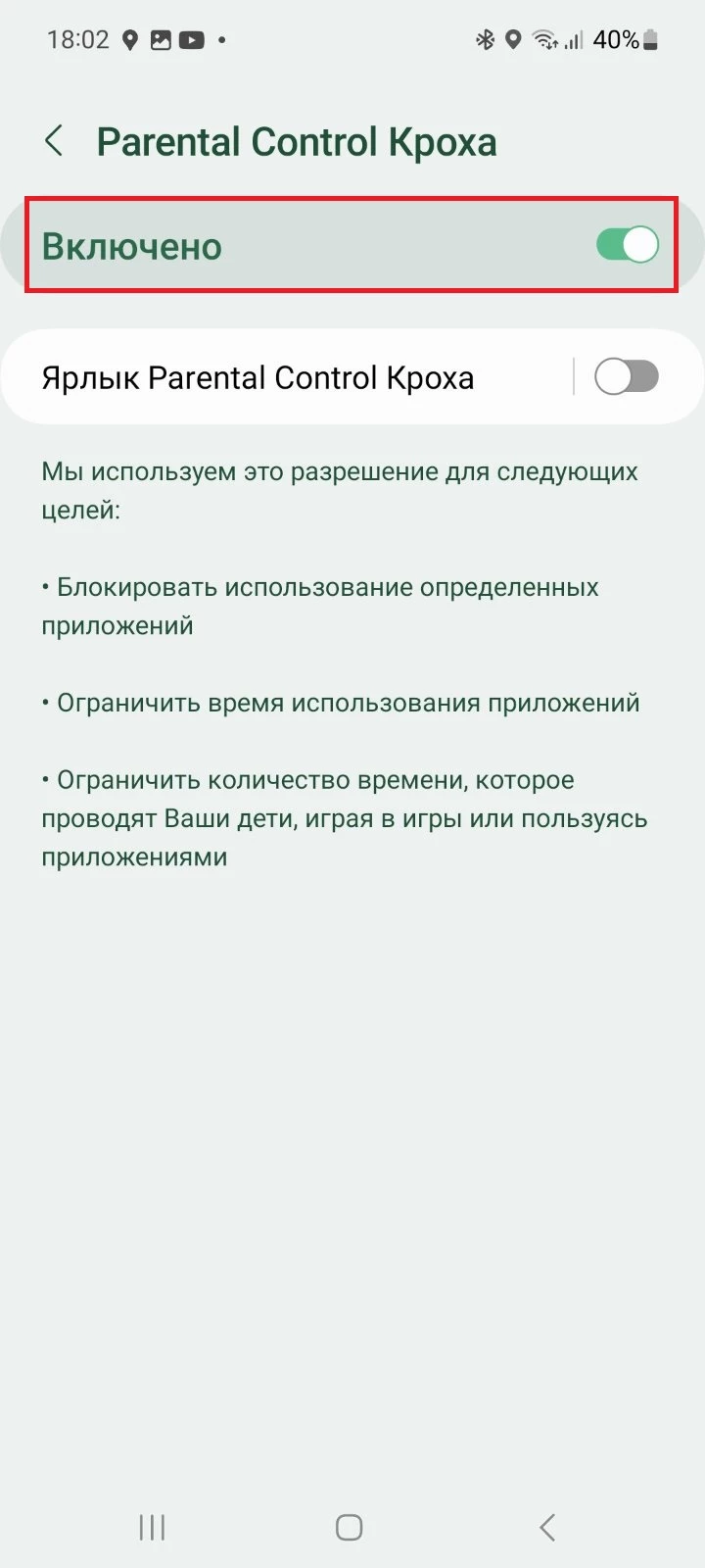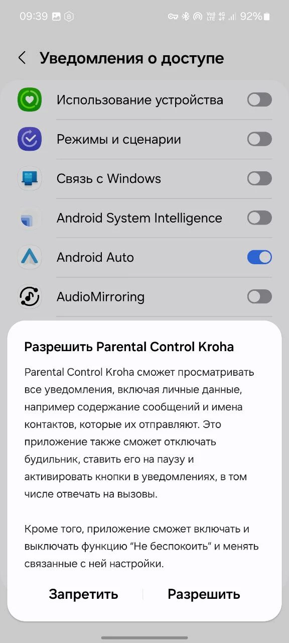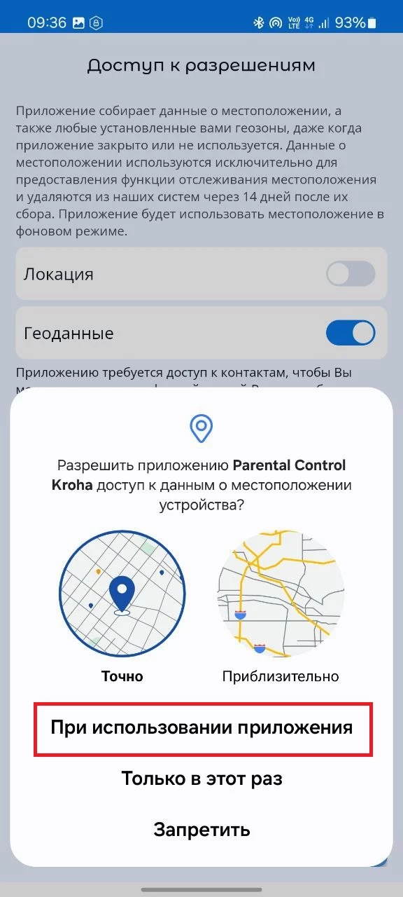 Для корректной работы приложения необходимо произвести настройку разрешений при подключении устройства ребенка к Вашему аккаунту.