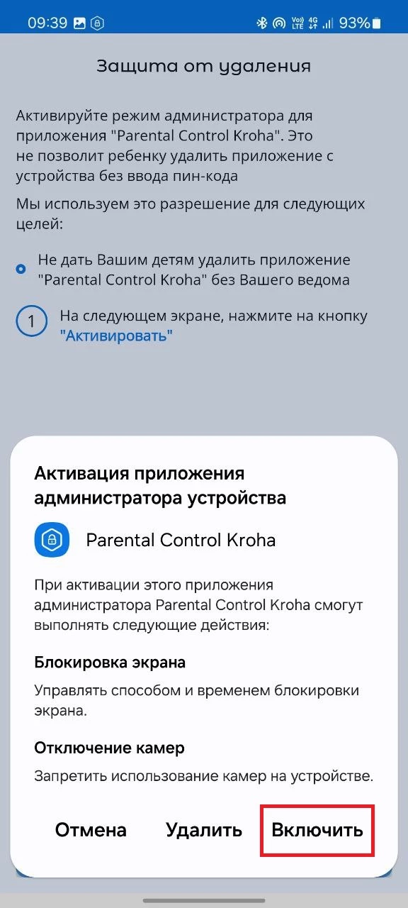 - «Защита от удаления», активируйте режим администратора для приложения Parental Control Kroha. Это не позволит ребенку удалит приложение с устройства без ввода пин-кода, для этого прочитайте пошаговую инструкцию и нажмите «далее»;