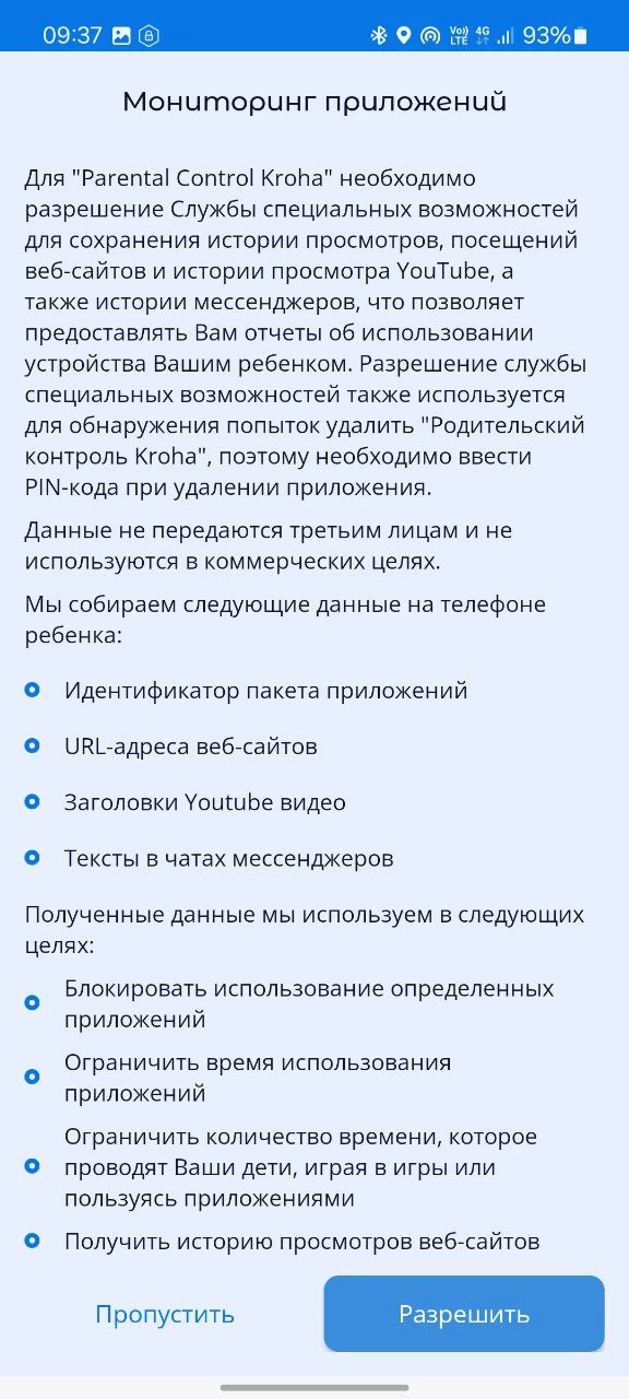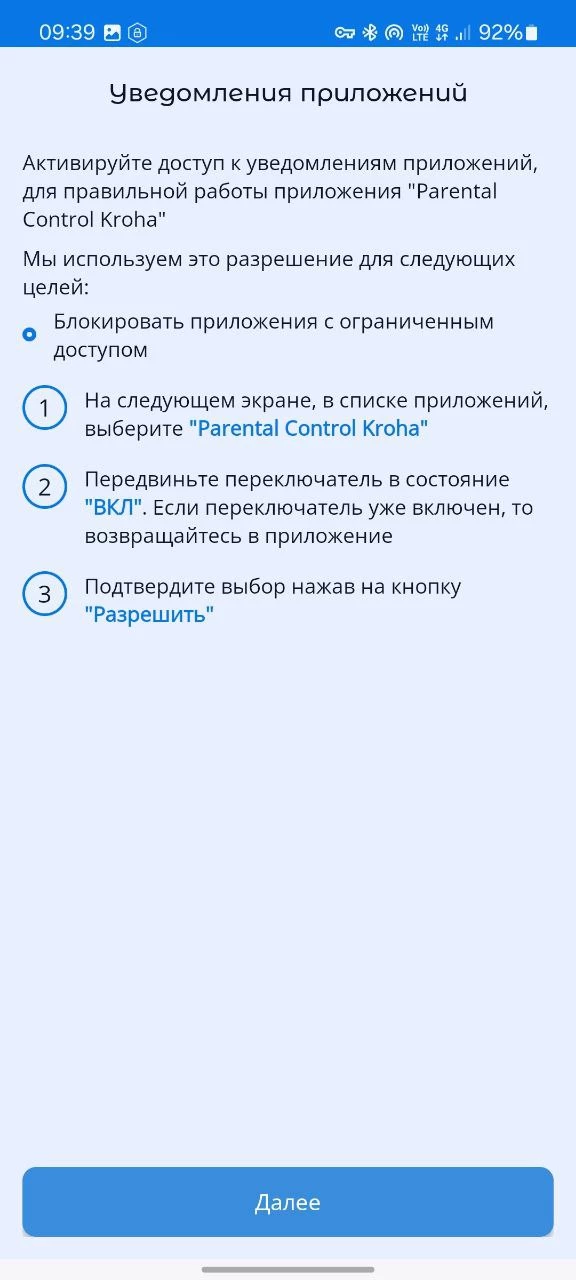 - «Использование приложений», активируйте доступ к данным об использовании приложений, для правильной работы приложения Parental Control Kroha, для этого прочитайте пошаговую инструкцию и нажмите «далее»;