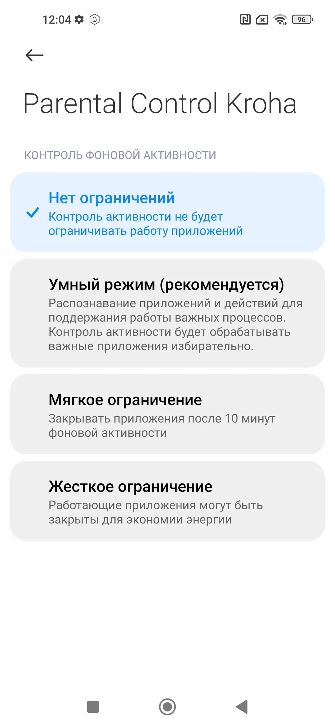 - «Автозапуск» и «Контроль фоновой активности», активируйте эти функции для того, чтобы приложение Parental Control Kroha запускалось автоматически при включении смартфона и чтобы приложение всегда работало в фоновом режиме и контролировало устройство ребенка.